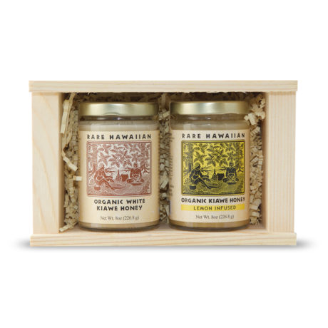 This gift box is truly a knockout combination of our famous Organic White Kiawe Honey and our Lemon Infused Kiawe Honey. If you haven’t tried our honey before, you’re in for a big surprise, since our gourmet honey will redefine your expectation for honey. And if you’re a Rare Hawaiian Honey veteran, you’ll love the addition of our Lemon infused Kiawe Honey. How about instant lemon tea? Or a little lemon honey drizzled on blueberries?? But don’t forget, if you don’t hide your honey from the rest of your family, it will be gone in a flash!